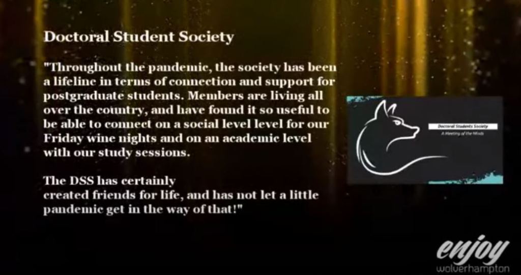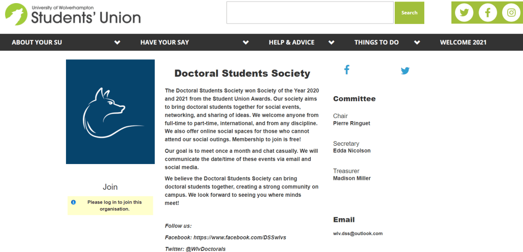 The Doctoral Students Society (DSS) is a post graduate researcher society at the University of Wolverhampton. Established in December 2019 by three dedicated PGRs (committee list below), the society aims to bring doctoral students together for social events, networking, and sharing of ideas.